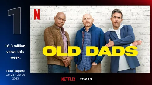 Het regiedebuut van Bill Burr, de komedie Old Dads, staat voor de tweede week op rij bovenaan de Engelstalige filmlijst van Netflix met 16,3M views, waarmee het totaal aantal views op 29,6M kwam in slechts tien dagen.