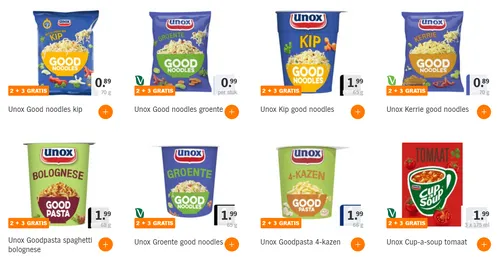 Deze aanbieding geldt op producten van Unox zoals Cup-a-Soup, pasta en Noodle gerechten, waaronder de verrukkelijke Cup-a-Soup tomaat en de smakelijke Bolognese Good Pasta.