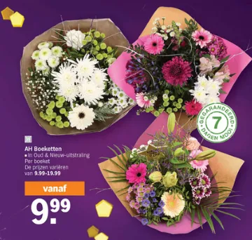 Een van de meest klassieke en stijlvolle geschenken die je kunt geven, is een prachtig boeket bloemen. De bloemen zijn niet alleen een symbool van schoonheid, maar ook een subtiele manier om te zeggen "Dank je wel" of "Ik hou van je". Bij Albert Heijn winkels kan je vanaf 9.99 euro een mooi boeket kopen. Je krijgt er onmiddellijk een 7 dagen mooi garantie bij.
