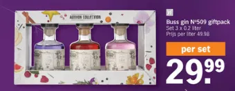 Bij Albert Heijn is een Buss gin N°509 giftpack in de aanbieding. Per set van 3x 0.2 liter gin betaal je 29.99 euro.