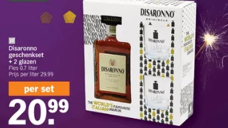 Een fles Disaronno geschenkpakket met 2 bijhorende glazen is van jou voor 20.99 euro.