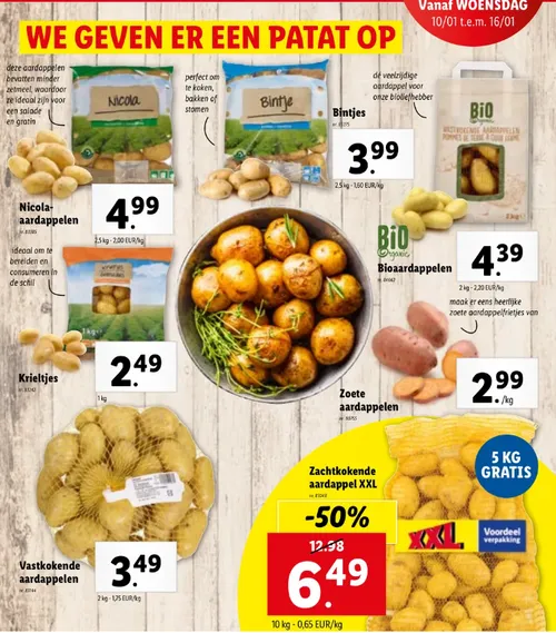 Maar het hoogtepunt van de week, dat moet wel de XXL promotie van zachtkokende aardappelen zijn. Voor een zak van 10 kilo betaal je maar voor 5 kilo. Dat is 50 procent korting! Om dit te vieren betaal je voor 10 kilo van 10 tot 16 januari slechts 6.49 euro. Een absolute buitenkans!
