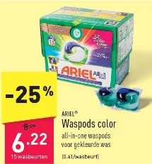 Als je je kleding liever wast met all-in-one pods, dan biedt Aldi ook Ariel waspods kleur aan. Op dit product ontvang je een korting van 25 procent. Vanaf zaterdag kan je een pakje van 15 waspods kopen voor 6.25 euro.