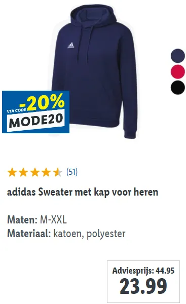 Doe mee aan deze geweldige promotie en update je garderobe met deze Adidas heren hoodie. De gewone prijs van deze hoodie is 44,95 euro.