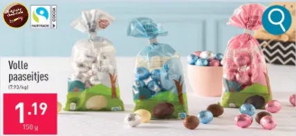 Naast de holle eieren heeft Aldi ook volle paaseitjes. Deze weelderige kleine verleidingen zijn gevuld met romige Belgische chocolade, en zijn verkrijgbaar in melkchocolade, witte chocolade en pure chocolade varianten.