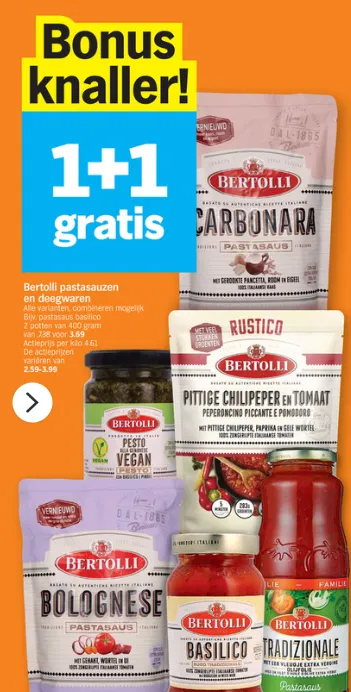 Laat je verleiden door heerlijkheden zoals Bertolli Pastasaus in zak kruidig, Bertolli Pizzasaus originale, en Bertolli Pesto alla Genovese vegan. Om er maar enkele te noemen.
