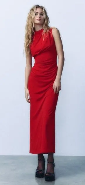 Ten slotte is de rode midi-jurk van Zara een absolute must-have voor wie houdt van een frisse en gedurfde kleur. De jurk heeft een opstaande kraag en geplooide taille, waardoor je figuur mooi wordt benadrukt. De midi-lengte en de subtiele opening in het rugpand geven de jurk een moderne uitstraling die ideaal is voor een feestelijke avond. Deze jurk is altijd een stijlvolle keuze die niet alleen kleur, maar ook veel flair toevoegt aan je feestgarderobe. Prijs: €39,95 bij Zara.
