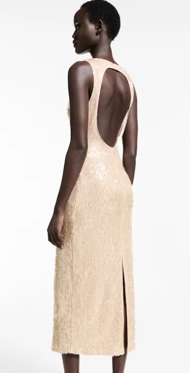 Deze gouden jurk met pailletten vonden we bij Mango. Het is een feestelijke keuze die je outfit doet schitteren. Deze jurk heeft een straight-fit model met een halterkraag en een open rug die een speelse, maar toch verfijnde uitstraling biedt. De pailletten glinsteren bij elke beweging en geven je de perfecte hoeveelheid glamour voor elke feestelijke gelegenheid. Dit veelzijdige stuk kan je zowel bij een chique diner als bij een druk feest dragen, en het beste van alles: je hoeft je geen zorgen te maken over extra accessoires, want de jurk doet al het werk. Prijs: €69,99.