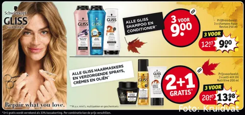 Nog tot 8 oktober biedt kruidvat haar klanten een promotie met haarmaskers aan van Schwarzkopf - Gliss. Je krijgt 2+1 gratis. Dé gelegenheid om goedkoop je voorraad aan te vullen of een keer een haarmasker te proberen. Bekijk de actie in hun