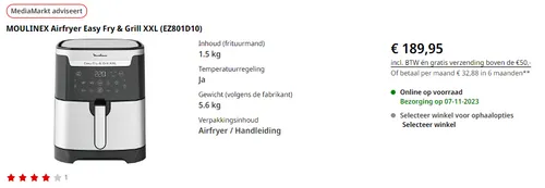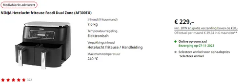 De prijs voor deze airfryer komt op 229 euro incl. BTW. (