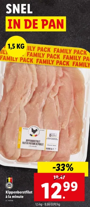 Lidl biedt niet minder dan 33% korting op kippenborstfilet. Dit betekent dat je een familypack van 1.5 kilo kunt krijgen voor slechts 12.99 euro, in plaats van de oorspronkelijke prijs van 19.47 euro. Dat is een besparing van bijna 6.5 euro!