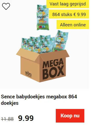 Eerst hebben we de Sence babydoekjes megabox met 864 doekjes: Perfect voor die snelle schoonmaakbeurten, deze doekjes zijn PH-huidneutraal, ontworpen voor de delicate babyhuid en doordrenkt met aloë vera-extract.