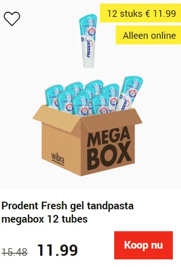 Nu krijg je 12 tubes Prodent "Fresh gel" tandpasta voor slechts € 11.99. Zo duur is het niet, toch? Slechts € 0.99 per tube. Prodent Fresh tandpasta geeft je een heerlijk muntgevoel voor dat extra fris gevoel.