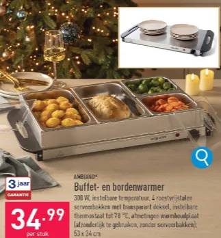Vanaf 20 december kan je bij Aldi een praktisch toestel vinden: een buffet- en bordenwarmer uitgerust met vier roestvrijstalen serveerbakken voorzien van een doorzichtig deksel. Twee van de bakken hebben een capaciteit van 2,4 liter en de twee andere een inhoud van 1 liter.