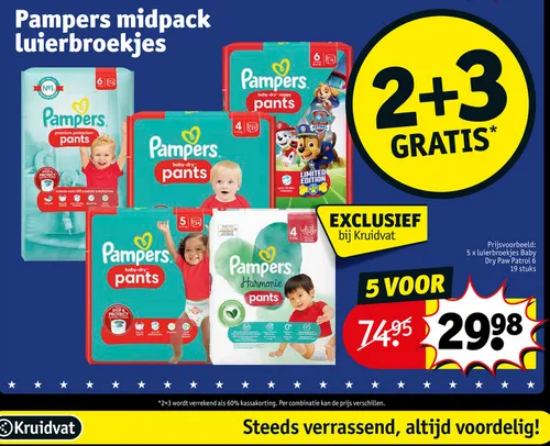Maar daar stopt het niet. Er is ook een 2+3 gratis aanbieding op Pampers midpack luierbroekjes.