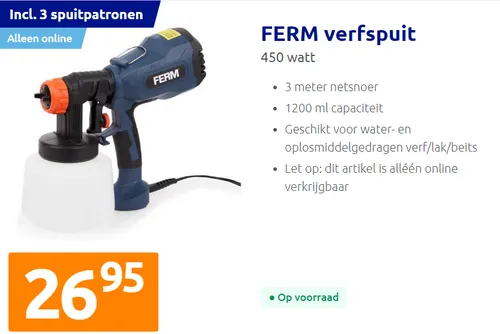 Omarm het gemak van modern schilderen met de FERM verfspuit, nu exclusief online beschikbaar bij Action. Bespaar kostbare tijd en moeite en ga voor een feilloos eindresultaat, zonder gedoe en zonder rommel.