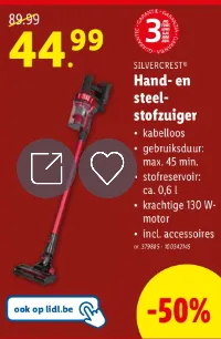 Bij Lidl koop je een handige hand- en steelstofzuiger nu in de solden met 50% korting!