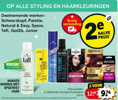 Deze actie is geldig op een brede selectie van producten. Of je nu op zoek bent naar droogshampoo, haarspray, haarkleuring of styling gel, er is iets voor iedereen.