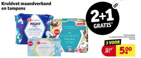 Kruidvat heeft nog tot en met 23 juni een geweldige promotie die je zeker niet wilt missen. Ze bieden een 2+1 gratis deal aan op een uitgebreid assortiment van maandverbanden en tampons.