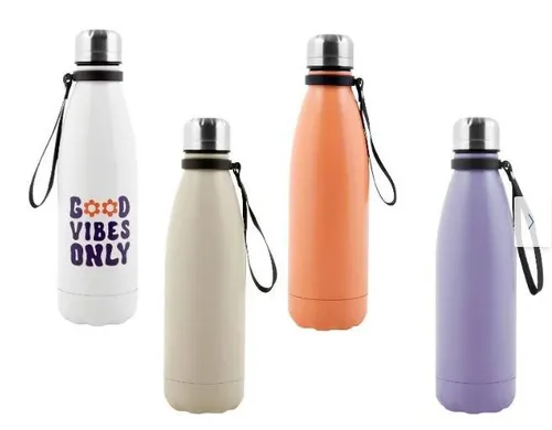 De fles is beschikbaar in verschillende kleuren zoals beige, lila, oranje en wit, zodat je altijd een stijl kunt vinden die bij je past. Het materiaal van roestvrij staal en de stevige draaglus maken het bovendien eenvoudig om de thermosfles mee te nemen.