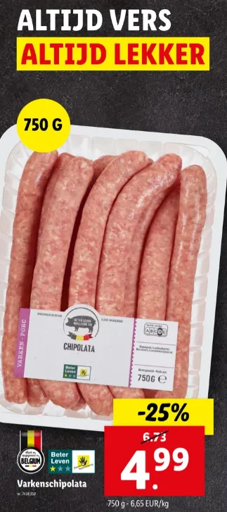 25% korting op een smakelijke worst van Belgisch origine bij Lidl!