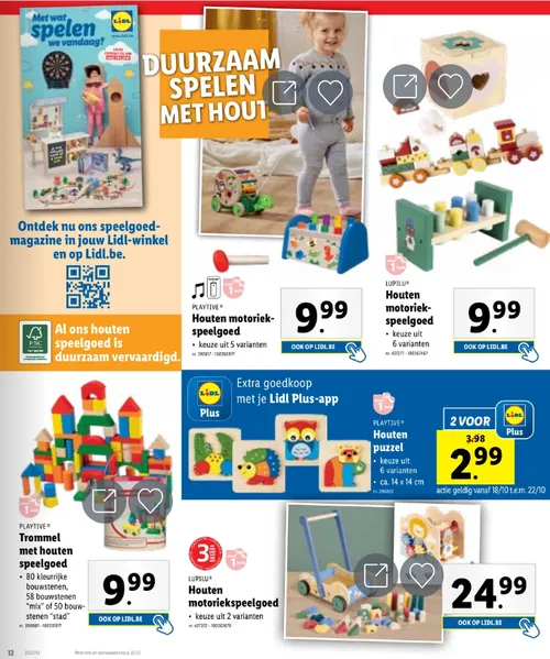 De supermarkten van Lidl gaan vanaf woensdag 18 oktober tot en met 22 oktober een heel gamma aan speelgoed in de kijker zetten. ‘Met wat spelen we vandaag’ luidt in de weekfolder enkele pagina’s van leuk speelgoed in.