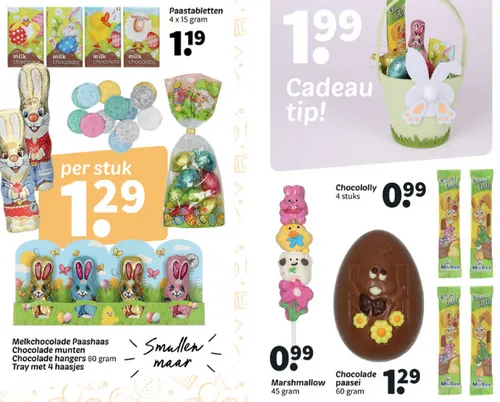 Het ruime assortiment belooft een zoete Pasen te worden, met onder andere een groot chocoladepaasei, chocoladelolly’s, chocoladetabletten en chocolademunten. Deze exclusieve lekkernijen zijn een fantastisch leuke manier om op Paaszondag kinderen - en volwassenen - te verwennen.