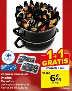 Carrefour heeft 1+1 gratis actie lopen voor heerlijke Zeeuwse mosselen!
