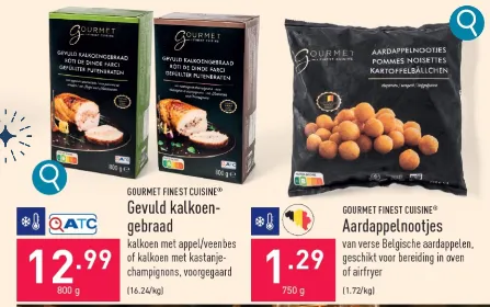 Maar natuurlijk kan je je gasten niet alleen aardappelnootjes voorschotelen. En dan kan je profiteren van gevuld kalkoengebraad. Er zijn enkele varianten beschikbaar in de filialen van Aldi waaronder appel/veenbes of kastanje/champignon.