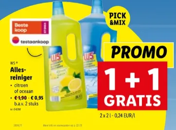 Bij Lidl kunt u deze week profiteren van een ongeëvenaarde promo op de allesreiniger. U kunt nu twee bussen allesreiniger van twee liter elk aankopen voor slechts 0.95 euro. Een dergelijke prijs voor deze kwaliteitsvolle allesreiniger is absoluut ongezien en een kans die u niet wilt missen.