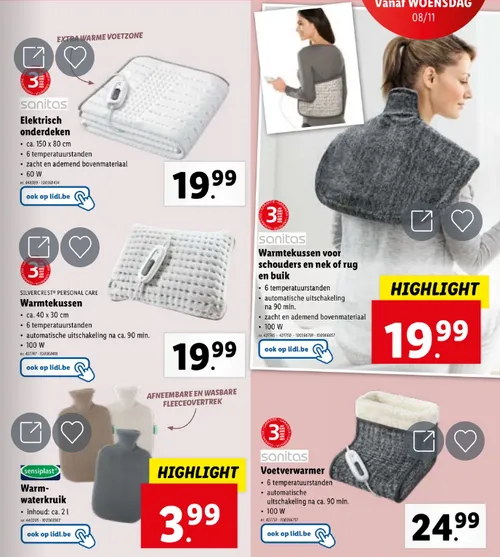 Vanaf woensdag 8 november schitteren enkele producten die je lichaam, spieren en voeten heerlijk opwarmen. Denk aan een zalig warmtekussen voor je schouders en nek, nu voor bijna een schamele 20 euro. Laat die aangename warmte maar komen!