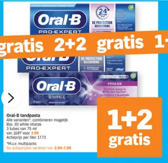 Oral-B tandpasta: Oral-B tandpasta’s nemen bijvoorbeeld deel aan de promotie. Wanneer je 1 tube koopt, ontvang je 2 tubes gratis. Er zijn 13 variëteiten beschikbaar, dus er is altijd iets voor iedereen.