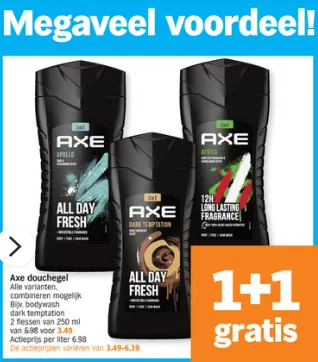 Axe douchegels: Het merk Axe heeft ook zijn douchegels in de aanbieding. De deal hier is 'koop 1 en krijg 1 gratis'. Een geweldige manier om te besparen! En er is een ruime keuze aan douchegels.