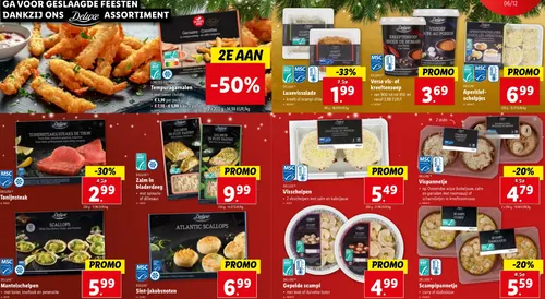 Vanaf 6 decembert is er een actie bij Lidl gestart. Onder het ruime assortiment van visproducten vinden we smakelijk fingerfood zoals tempuragarnalen met dipsaus en luxe vissalades om je knapperige toastjes mee te besmeren.