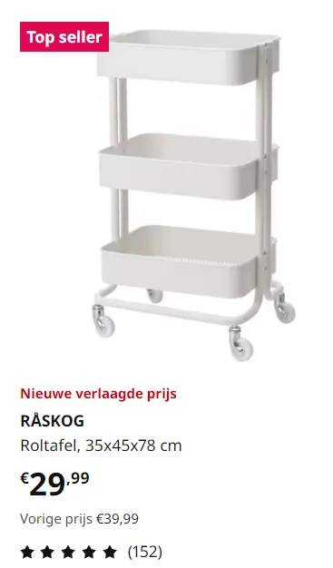 De prijs van hun topseller roltafel, met afmetingen van 35x45x78 centimeter, is substantieel verlaagd met 10 euro. Voorheen verkrijgbaar voor 39,99 euro, kan deze veelzijdige roltafel nu voor slechts 29,99 euro worden gekocht.