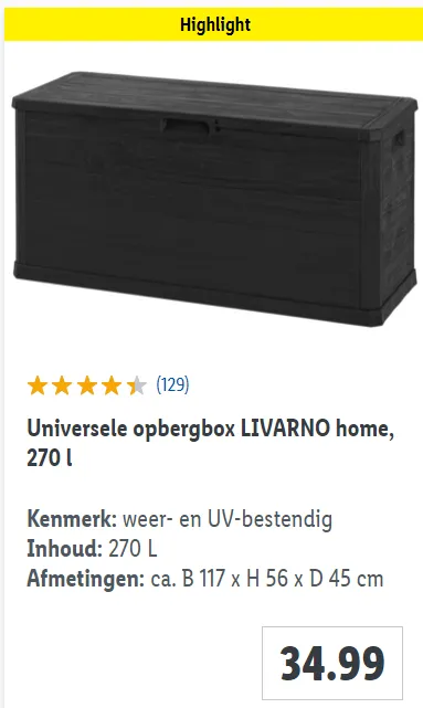 Als je echter grotere items moet opbergen, dan zal de Universele opbergbox LIVARNO home, 270 l, van 34,99 euro, je niet teleurstellen.