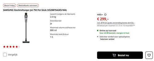 Dankzij de Black Friday-actie ontvang je een korting van maar liefst 33 procent op deze stokstofzuiger. In plaats van 448 euro kun je dit apparaat tot 27 november aanschaffen voor slechts 299 euro per stuk.