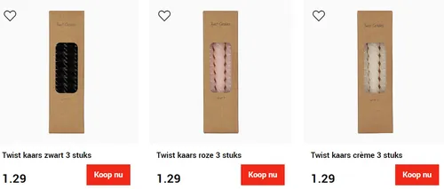 Er zijn verschillende kleuren beschikbaar en ze zullen zeker de aandacht trekken. Je kunt deze twistkaarsen kopen voor 1.29 euro voor 3 kaarsen. Dus nu je in de stemming bent, is het misschien het juiste moment om deze ook in je winkelwagentje te leggen.